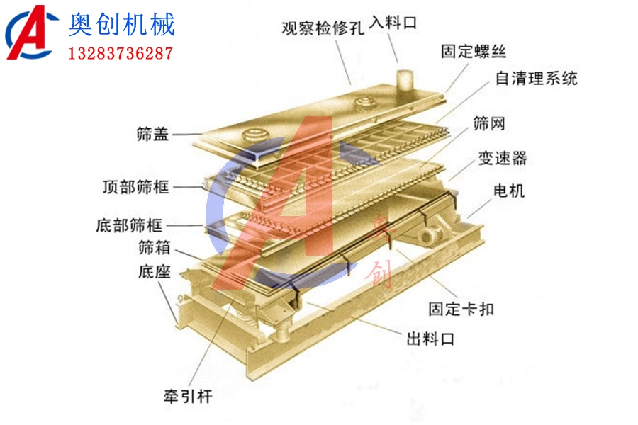 平面回轉篩組成:平面回轉篩結構圖。平面回轉篩主要是由篩箱、驅動裝置、篩架、支撐架和減振裝置等組件構成...